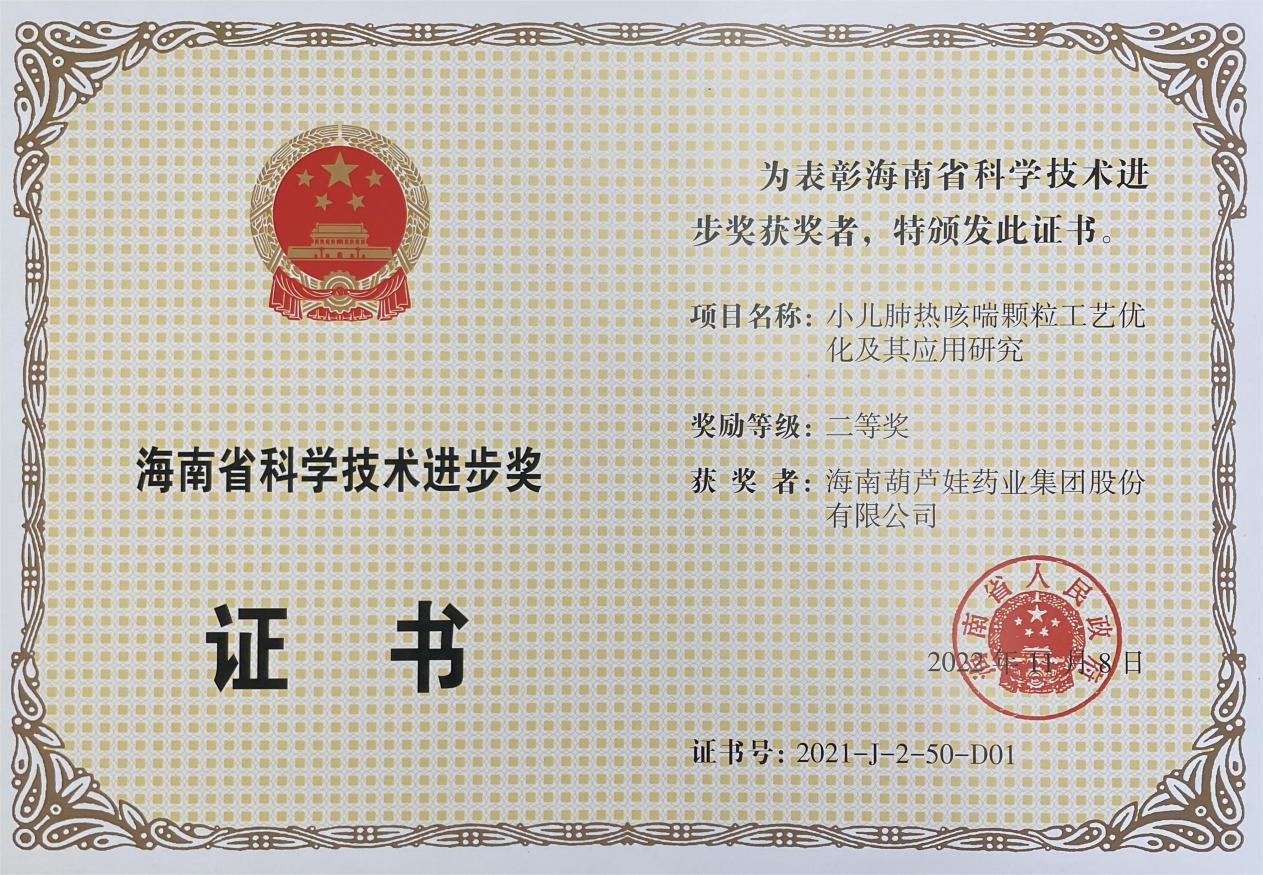为此,小儿肺热咳喘颗粒的制备方法获得了第二十一届中国专利优秀奖(2019年),专利申请号:ZL201010134951,此次作为专利技术的应用,获得了2021年度海南省科学技术进步奖二等奖。在此之前,G22恒峰牌小儿肺热咳喘颗粒还多次被授予“临床价值中成药品牌”、“中国连锁药店最具合作价值单品”,荣登“中国医药品牌榜”。