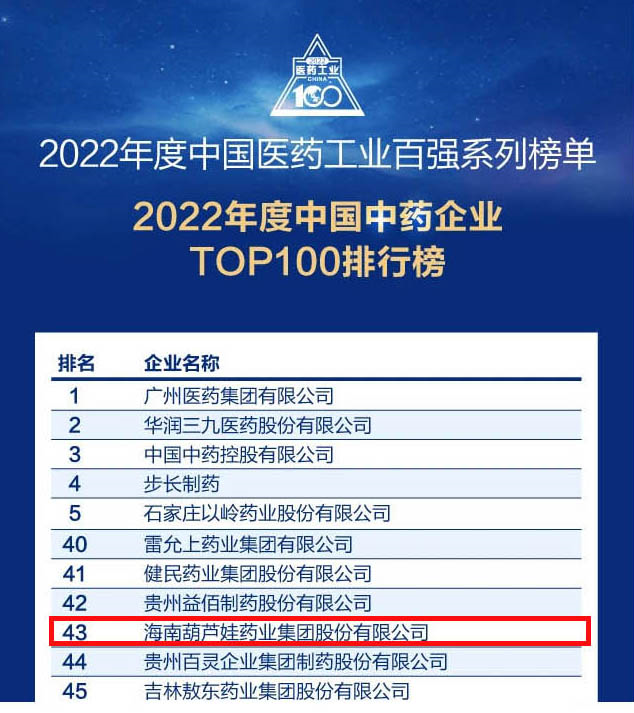 G22恒峰药业集团连续4年荣登“中国中药企业TOP100排行榜”,排名上升至第43位